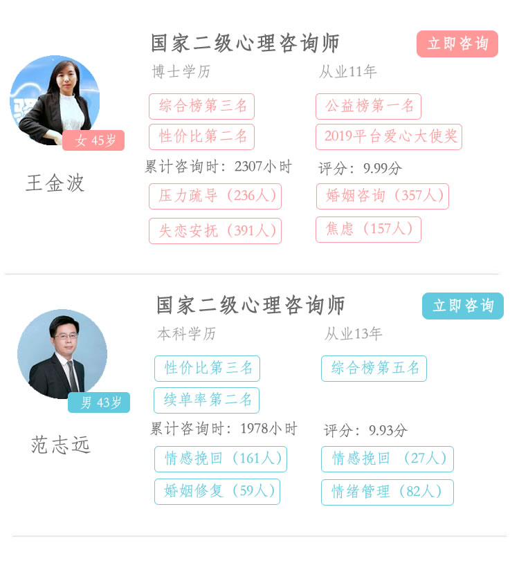 評(píng)分:10用戶評(píng)價(jià):咨詢前后都有好幾個(gè)小時(shí),老師分析問(wèn)題很專業(yè)很到位,每次掛完電話心里就會(huì)輕松很多,本人還是搞醫(yī)的,接觸過(guò)心理什么的,但通過(guò)自己遇上事兒咨詢后才知:專業(yè)的才最好最有用,因經(jīng)濟(jì)文化等多方原因國(guó)內(nèi)對(duì)心理咨詢很不理解很漠視,很多人甚覺(jué)得心理咨詢了就是有精神不好,丟人,真的太誤解了,本人覺(jué)得向身邊人無(wú)法訴說(shuō)或說(shuō)了也沒(méi)用真該心理咨詢,專業(yè)建議比起朋友親威來(lái)強(qiáng)太多, -